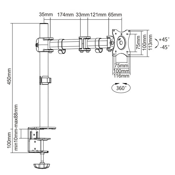 - Endless Customization - Monitor arm tilts +/- 45 degrees, swivels 180 degrees, and rotates 360 degrees.